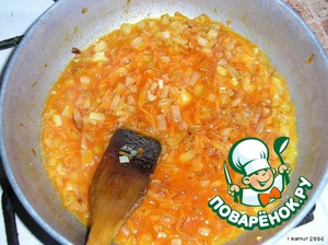 Из лука, моркови и томатов сделать зажарку, как на борщ.