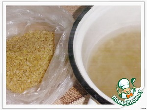 Булгур залить кипятком, закрыть крышкой и оставить на 30 минут. Через 30 минут излишки воды слить, крупу отжать.