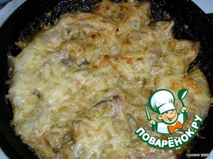 Выложить в сковородку, посыпать тертым сыром (можно блюдо вообще не солить - сыр и соевый соус дают соленый вкус).