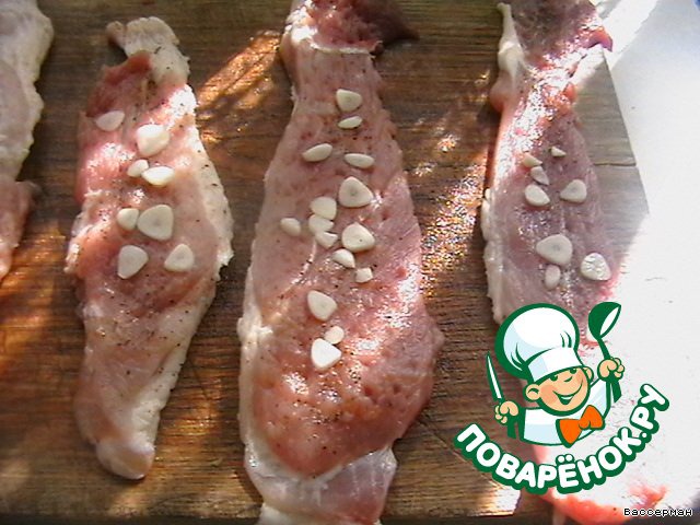 • Нарежем мясо тонкими пластинами, отобьем, посолим, поперчим по вкусу. Чеснок нарежем ломтиками и разложим.