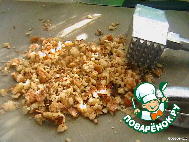 • Пока рулетики доходят, приготовим соус. Орехи очистим и помнем боковой стороной молоточка для отбивания.