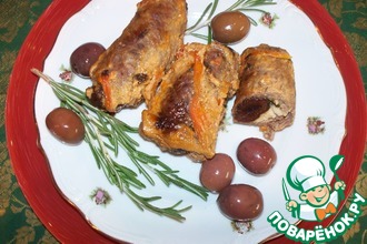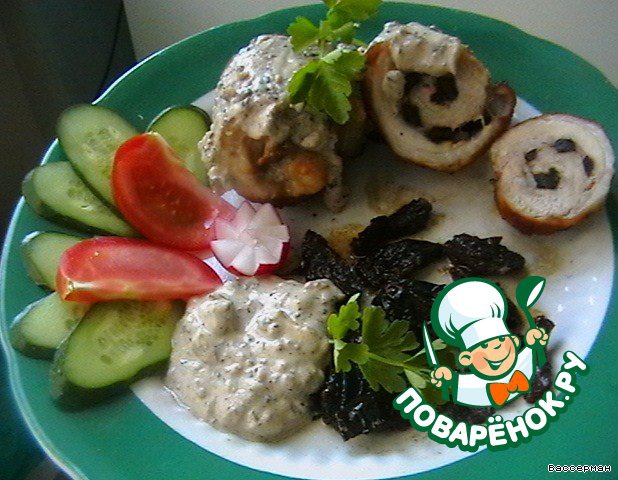 • Выложим наши рулетики на тарелку, польем соусом, гарнируем тушеным вместе с мясом черносливом и украсим по своему вкусу.