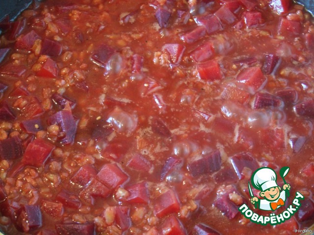Готовить, пока перловка не будет готова и пока свекла не будет мягкой. Если весь бульон закончится, то можно добавить немного воды. Когда все готово, добавить кинзу и лимонный сок. Все перемешать и проверить на специи.