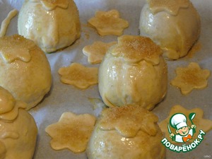 Вырезать крышечки (у меня сейчас юбочки) и снова смазать яблочки желтком
