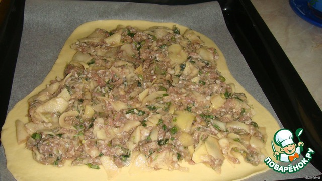 Заготовку переложить на противень, сверху выложить начинку
