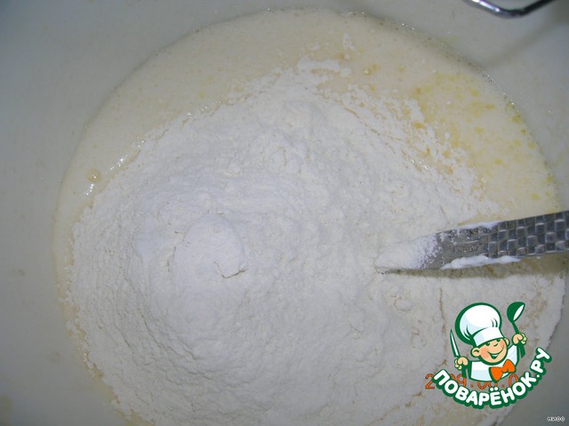 Добавляем растопленное сливочное масло, сметану, просеянную муку, разрыхлитель, ром. Тщательно перемешиваем.