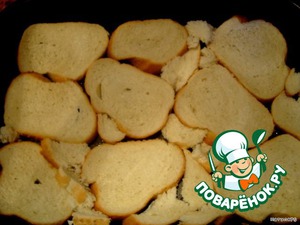 Противень сбрызнуть маслом. Уложить нарезанный батон.
