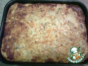 В форму, выстеленную пергаментом (можно и без пергамента, но у меня форма с покрытием, и не хотелось потом ни ножом, ни лопаткой царапать) выкладываем 1/3 часть моркови, сверху половину рыбки и половину лука.