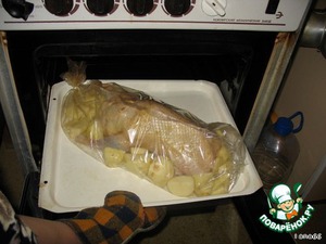 В рукав укладываем утку и обкладываем картофелем. Помещаем в разогретую духовку и запекаем 2 -2, 5 часа.