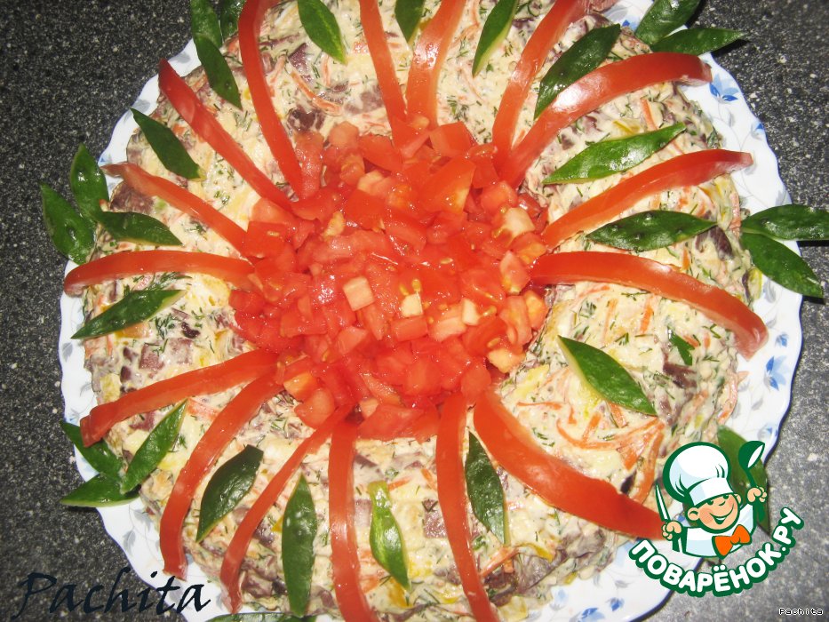 Продолжаю тему салатов с субпродуктами. На это раз с легким и овощами. Прекрасное сочетание корейской морковки с отварным лeгким, помидорками, перчиком, зеленью... и яичным омлетом. Очень сочно и вкусно. )))