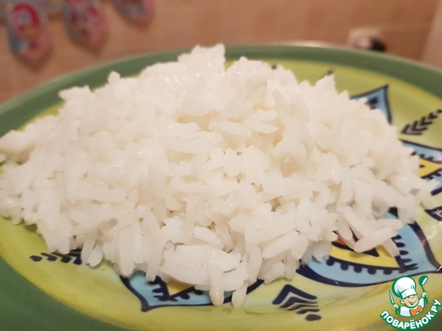 Заливаем промытый рис водой в пропорции 1 стакан риса - 2 стакана воды и ставим кастрюльку на большой огонь. Когда вода закипит, варим рис под крышкой 4 минуты на большом огне, потом 4 минуты на среднем огне и наконец последние 4 мин. на очень маленьком огне. Потом выключаем газ и даем настоятся не снимая крышки еще 10 минут. Рис готов.