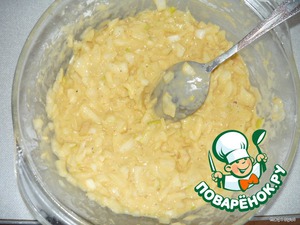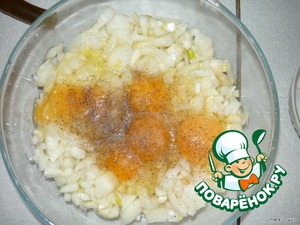 5 луковиц мелко режем.Блендером и мясорубкой пользоваться не рекомендуется,т.к. лук тогда может горчить(не знаю,не проверяла:))