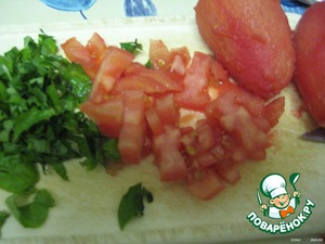 Куриное мясо отделяем от костей, перемешиваем с помидорами и зеленью и выкладываем на блюдо с высокими бортиками;