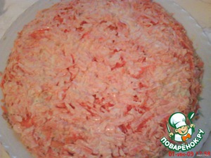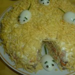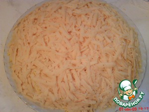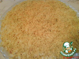 Шестой слой - яичные желтки, натертые на крупной терке.