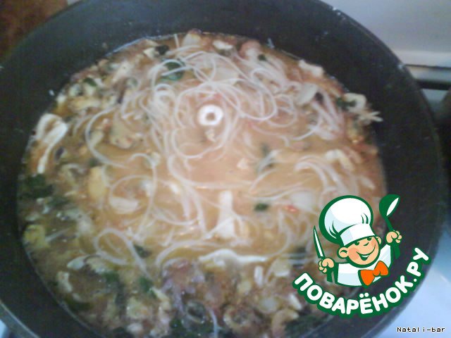 • еще надо отварить лапшу( как написано на упаковке, только чуть чуть не до варить, стеклянную я просто опускаю в кипяток на 1 минутку, а потом вытаскиваю), мне нравится китайская рисовая(тоненькая стеклянная, но можно использовать любую). Все перемешать и еще минут 5 потушить, хотя я все делаю по вкусу.