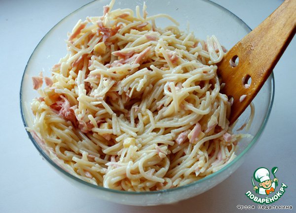 В глубокой посуде смешать ветчину, сыр, спагетти, раздавленный зубчик чеснока, добавить яйцо, соль, перец, перемешать.
