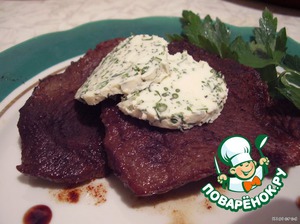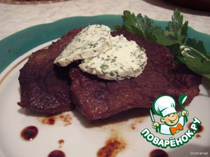 Снимите мясо со сковороды, положите его на тарелку, а сверху выложите кусочки сливочного масла с зеленью