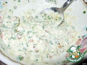 Желатин замочите в холодной кипяченой воде на 40 минут. Затем распустите на слабом огне. Смешайте с сырной массой до кремообразного состояния. -