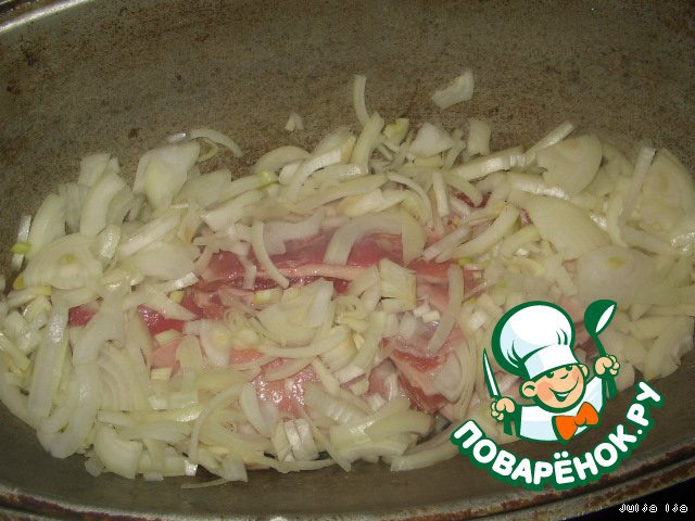 Рёбрышки и лук нарезать. Лук я резала соломкой, но это на Ваш вкус, можно нарезать мельче, и тогда он совсем растворится и не будет чувствоваться.