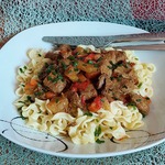 Необычно, вкусно, быстро. Яблоко добавляет пикантную нотку. Я советую выбрать несладкий сорт яблок. Перед тушением мяса, обваляла кусочки в муке. Подливка получается более густой.