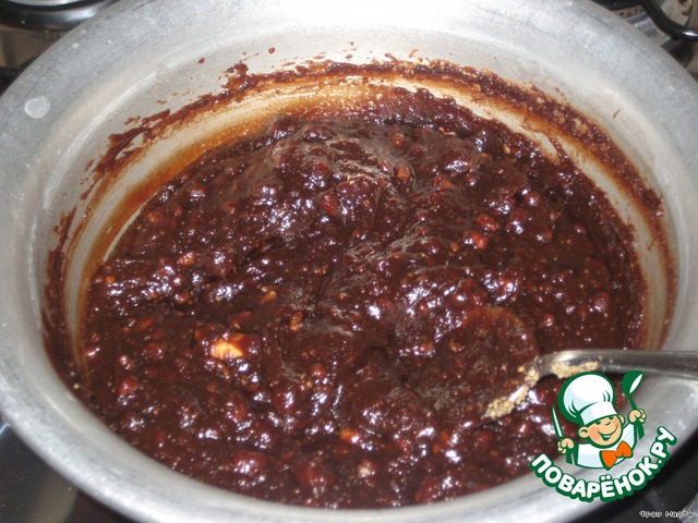 Все ингредиенты хорошо перемешать и варить на медленном огне, постоянно помешивая, до загустения. Добавить масло и крупной крошкой печенье, перемешать до однородности. Снять с огня.