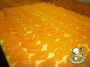 Мандарины откинуть на дуршлаг, хорошенько слить жидкость, разложить дольки по всей поверхности нашего теста.