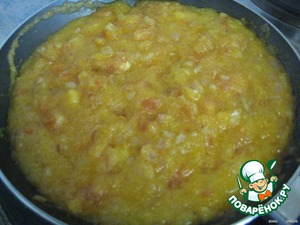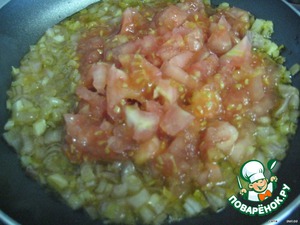 Добавим измельченную мякоть томатов и тушим на маленьком огне, пока жидкость не испарится.