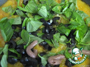 Измельчим базилик, анчоусы и оливки и добавим к поленте, хорошо перемешаем.