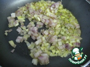 На оливковом масле обжарить мелко нарезанные лук и чеснок.