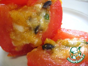 Помидоры помыть, обсушить, срезать верхушку и осторожно вынуть мякоть.