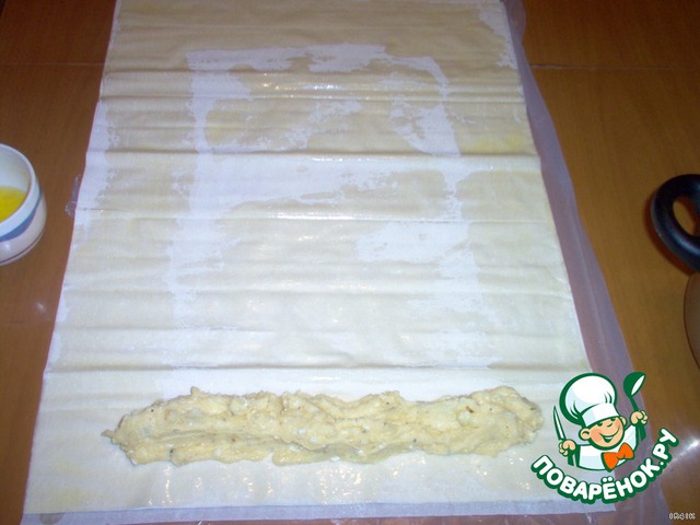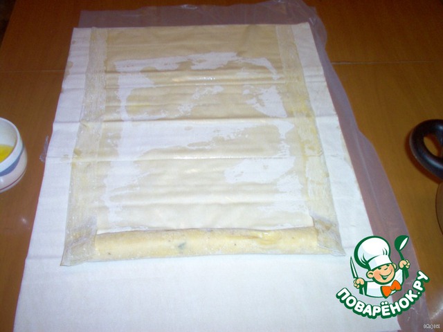 • Берем готовые листы теста фило и по периметру обильно смазываем оливковым маслом, середину тоже немного смазываем. На край теста кладем начинку, отступая от края на 2 см,