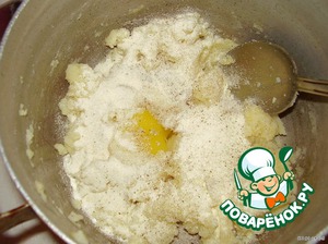 • В картофельное пюре добавить 1 яйцо и 2 столовые ложки манки, соль, перец и перемешать