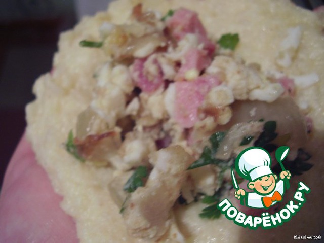 • Теперь делаем кружок из картофельного теста, выкладываем начинку и формируем котлетку-зразу (для ленивых - начинку можно просто смешать с картофельным тестом, получится также вкусно, просто не будет видно отдельно начинку при разрезе)
