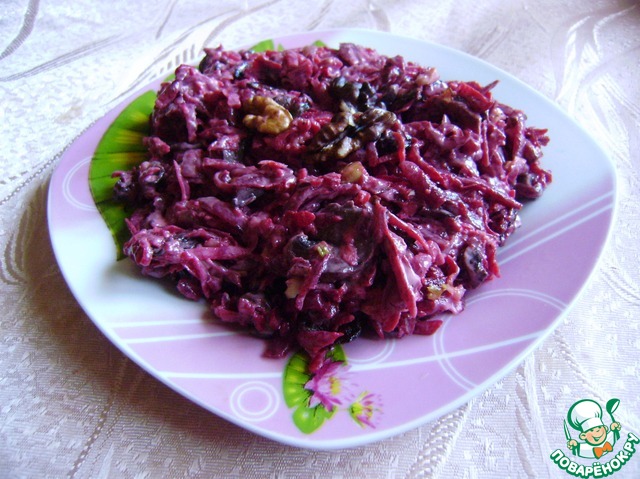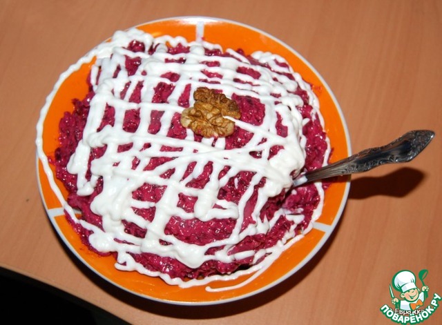 Выложить в салатницу, украсить половинкой грецкого ореха