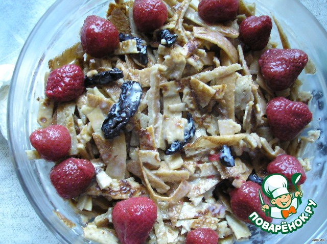 Очень вкусный и необычный десерт. Принесла как-то подружка блинов. Ели мы их ели, но ещe осталось. И тогда я сделала.. блинный салатик. Муж был в полном восторге.