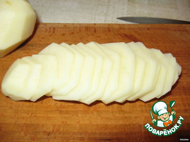 Картофель вымойте, очистите и нарежьте тонкими ломтиками.