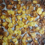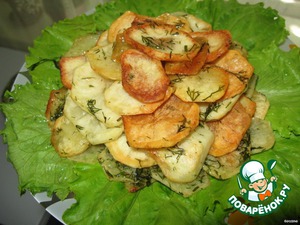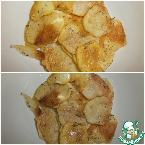Выложите ломтики картофеля на противень и запекайте 25 минут при температуре 210 градусов.