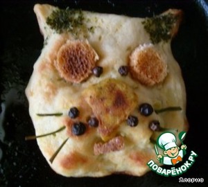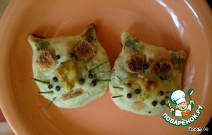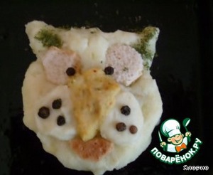 На лепешках лепим ушки, немного теста смешиваем с приправами для картофеля для добавления цвета, из него лепим носики, оформляем мордочки горошинами перца.