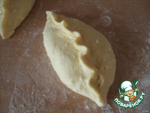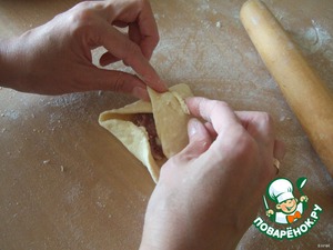Раскатаем лепёшечку, на середину кладем фарш, и масло сливочное (маленький кусочек).Защипываются они косичкой. Закроем верх и низ пирожка.