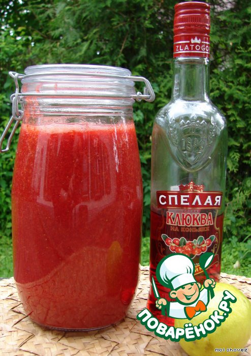 - Алкоголь (настойка, по вкусу, у меня была "Клюква на коньяке", можно водку + клубничный сироп, по вкусу; у меня была "Клюква на коньяке", можно водку + клубничный сироп) — 100 г
