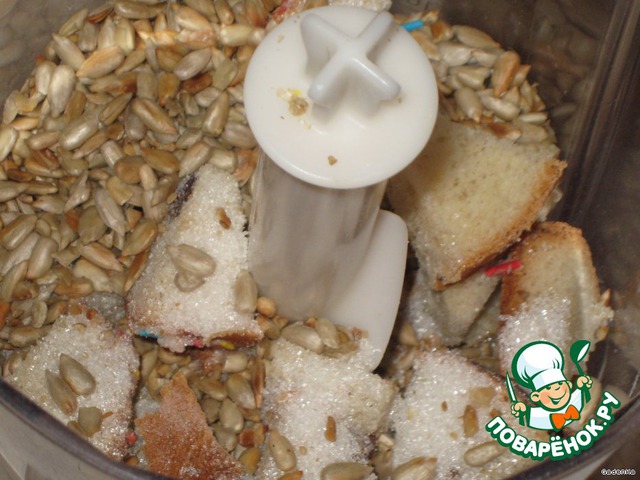 В комбайн сложить порезанную булку, семечки, сахар, все превратить в крошку.