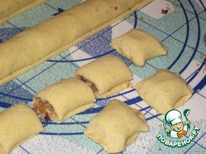 Обрезать ножом колбаску от основного теста, затем повторить все заново. Начинку на тесто. Свернуть, обрезать.