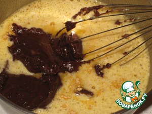 В яйца добавить имбирь, ликер, перемешать, затем добавить шоколадную массу, все тщательно перемешать венчиком, чтобы была однородная масса.