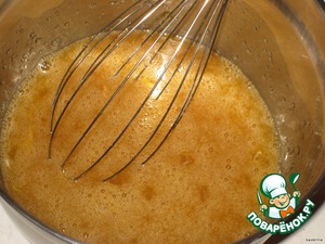 Яйца вручную, венчиком, взболтать с сахаром до однородности. Чтобы не выделялись белки и желтки, но без пены, добавить кукурузную муку, вымешать массу, чтобы не было комочков. -