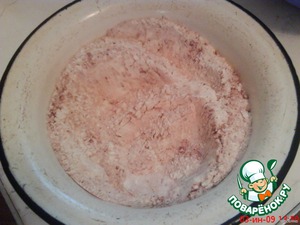 Смешать муку, какао, соль, разрыхлитель и просеять сверху.