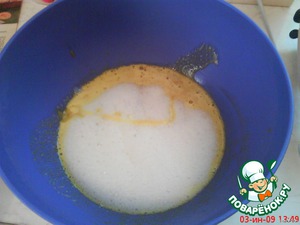 Отделить белки от желтков. Перемешать желтки с 3 ст.л. горячей воды, 100 г сахара и ванильным сахаром.