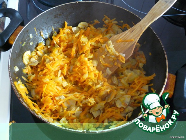 Для начала готовим начинку: мелко нарезаем лук, морковь натираем на крупной терке, грибы нарезаем на кусочки и все это обжариваем до золотистого цвета.
