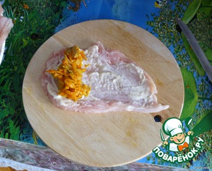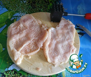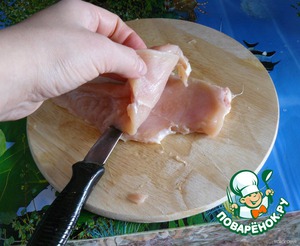 Каждый кусочек куриного филе разрезаем на две части. Конечно, можно делать рулеты и из цельного куска филе, но тогда они будут крупнее и грубее.