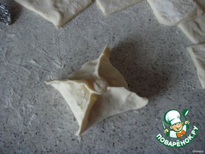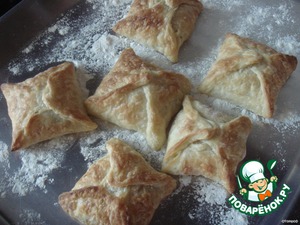 Слоёное тесто разделить на 12 квадратиков и раскатать немного каждый. на середину положить начинку и защипнуть углы противоположно, и соединить стенки между углами.