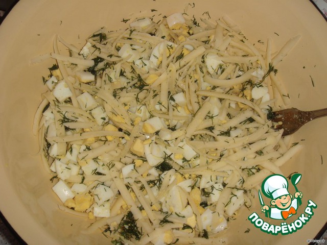 Отварить яйца, порезать их кубиками и смешать с порубленной зеленью и тёртым сыром.